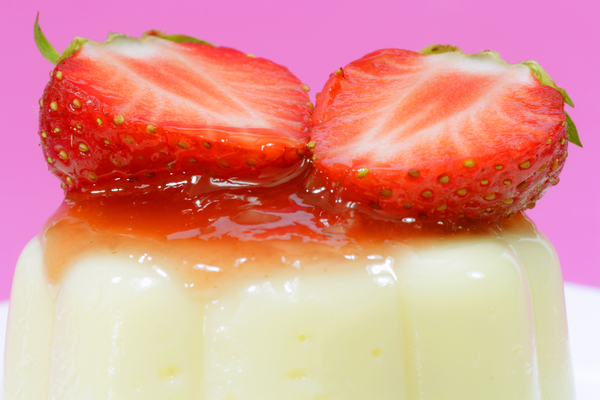 6. Готовый пудинг подавать с клубничным сиропом, украсив свежими ягодами.