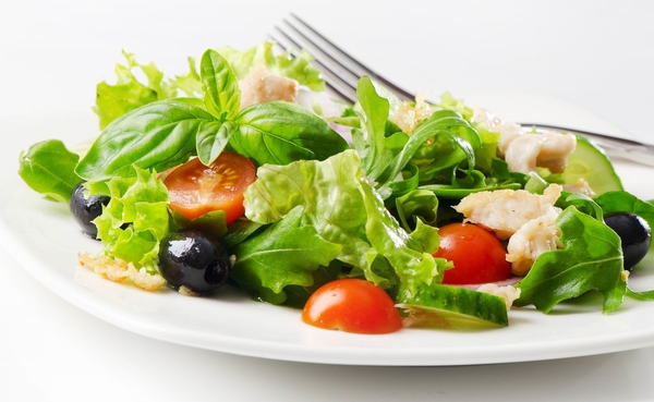 7. На большом  плоском блюде, на котором ты будешь подавать салат, разложи сначала салатные листья, затем положи в произвольном порядке остальные ингредиенты – кусочки курицы, маслины, помидоры, ветчину, сыр и яйца. Все это надо полить заправкой.