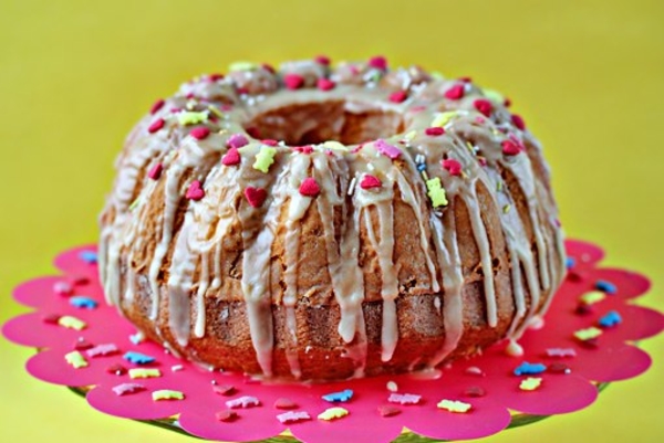 - Полить кекс глазурью и украсить его разноцветными сахарными украшениями.