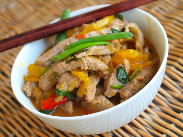 1. Мясо нарезать тонкими полосками длиной 2 см, положить в миску и полить соевым соусом. Тщательно перемешать. оставить на 30 минут.