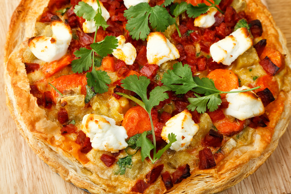 5. Выложить начинку на дно пирога, сверху разложить кусочки феты или камамбера.