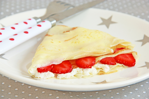 4. Выложить начинку на блины, разложить сверху кусочки клубники и свернуть треугольником или рулетом.