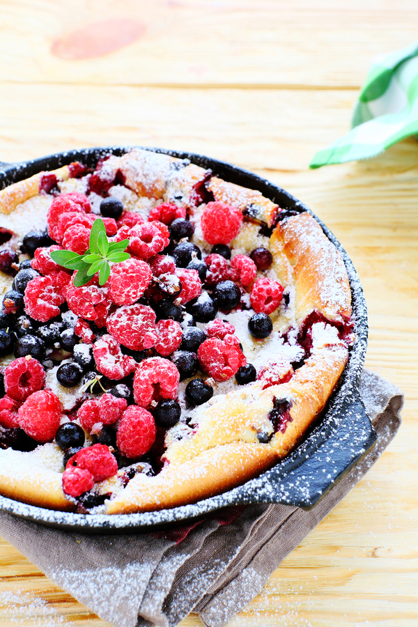 Датские блинчики интересны тем, что запекаются в духовке, и подаются к столу с ягодами и сахарной пудрой.