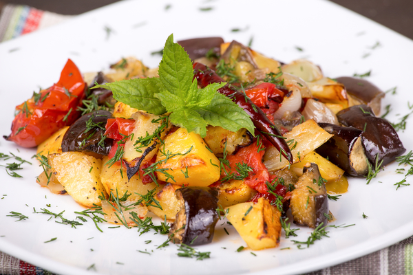 3. В сковороде разогреть растительное масло и обжарить в нем лук до золотистого цвета. Добавить баклажаны, кабачки и продолжать готовить, пока овощи не приобретут золотистый цвет, затем добавить чеснок и острый перец.