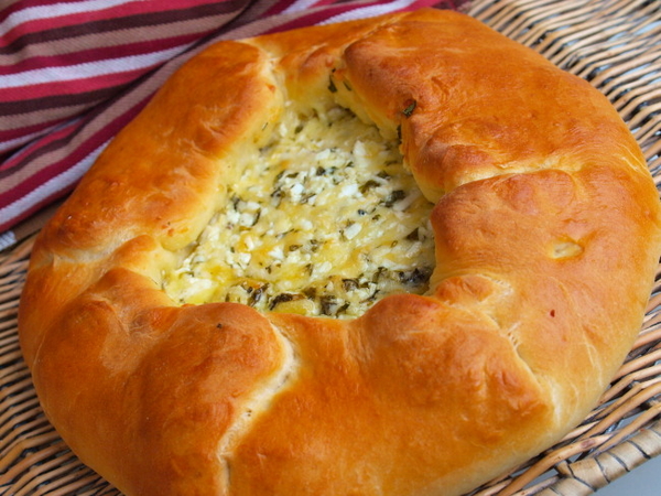 3. Весь сыр и брынзу натереть. Смешать сыр и брынзу я яйцом и сливками. Мелко нарубить свежую зелень, добавить в смесь и посолить начинку по вкусу.Тесто раскатать так,чтобы получился круг, поместить его в форму,смазанную маслом, выложить на тесто начинку, прикрыть ее краями теста, скрепить их,