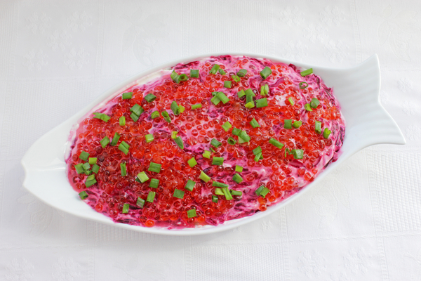 5. Готовый салат украсить красной икрой и нарезанным зеленым луком.