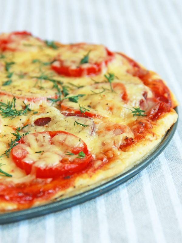 Вкусная домашняя пицца с балыком, салями, чесноком, помидорами и сыром.