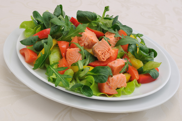 Рыбный салат из запеченного лосося, сладкого перца, томатов и зелени.