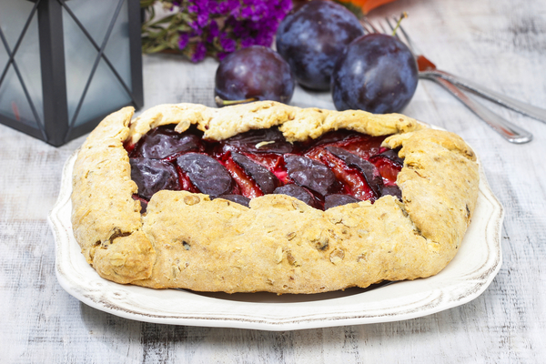 4. Выложить сливы на тесто, отступая от краев на несколько сантиметров. Посыпать крахмалом, сахаром и корицей.