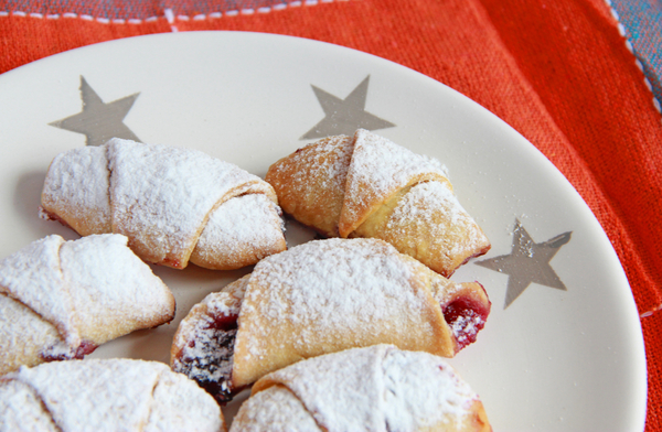 4. Выложить рогалики на противень, застеленный бумагой для выпечки. Готовить в разогретой до 180 градусов духовке около 20 минут или до золотистого цвета. Готовые рогалики слегка остудить и посыпать сахарной пудрой.