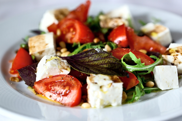 Простой салат из томатов, рукколы, базилика, сыра и кедровых орехов можно подавать как гарнир к мясу или как самостоятельное летнее блюдо.