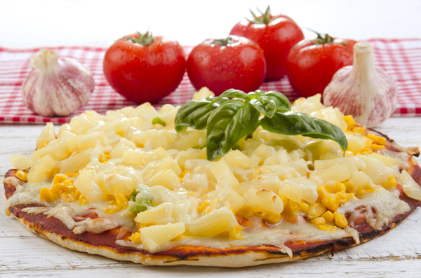 Вегетарианская пицца на пышном тесте с томатным соусом, ананасами, кукурузой и сыром.