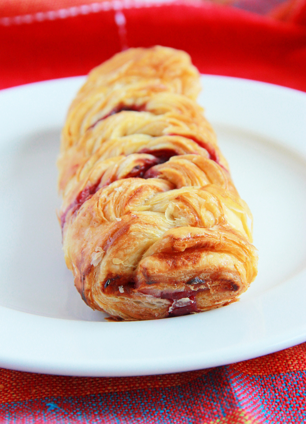 4. Выложить по всей длине теста начинку, аккуратно завернуть внутрь край, а затем поочередно подбирать тесто слева и справа, заворачивая его в косичку. Оставшийся край тоже нужно загнуть внутрь.