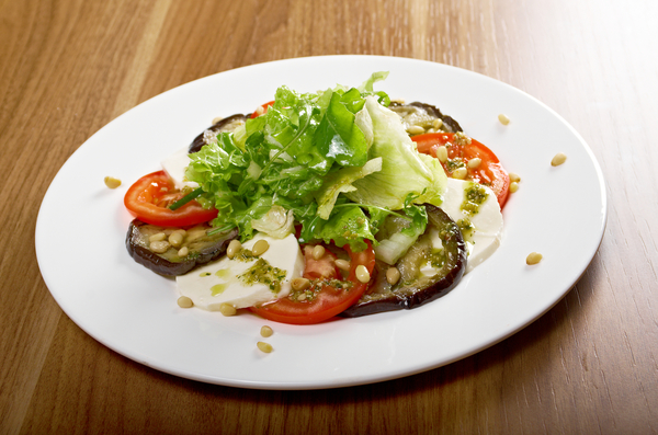 Итальянскую закуску капрезе традиционно готовят из помидоров, базилика и моцареллы. Блюдо будет более оригинальным, если добавить в него баклажаны и кедровые орехи.