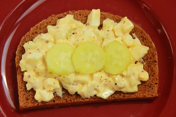 4. Переложить в миску яйца и огурцы, полить заправкой и хорошо перемешать. Подавать салат на ломтиках ржаного хлеба.