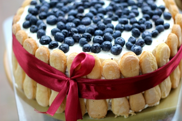 8. Торт можно декорировать по бокам печеньем савоярди и завязать шелковой лентой.