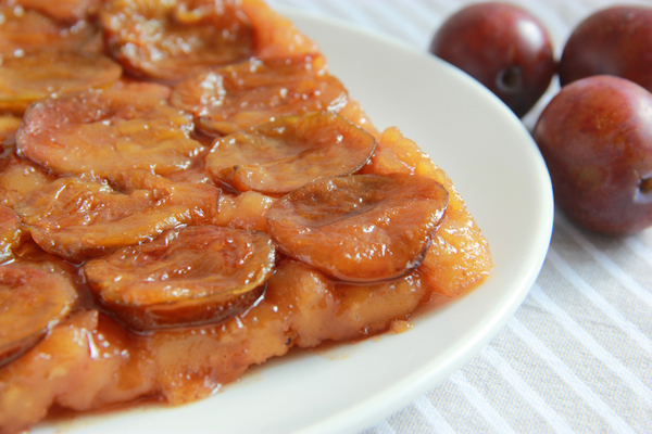 3. Растопить сливочное масло в сотейнике, добавить сахар, ваниль и корицу. Готовить, пока смесь не начнет пузыриться и приобретать золотисто-коричневый цвет. Вылить карамель в неразъемную форму. Разложить половинки слив кожицей вверх.