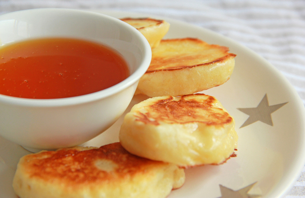 Эти оладьи очень хороши с медом, сметаной или вареньем.