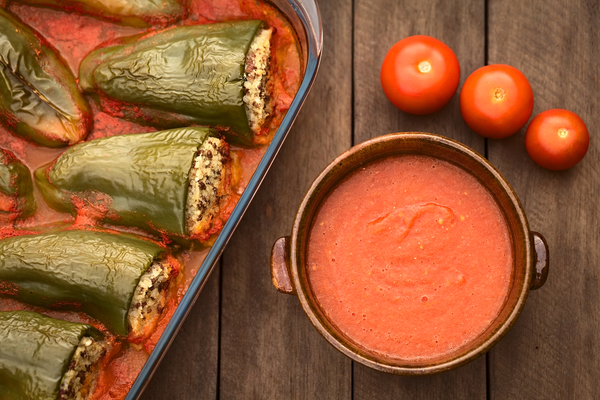 5. Нафаршировать перец мясной смесью и поместить в глубокую форму для запекания. Налить оставшуюся томатную смесь на фаршированный перец. Выпекать при температуре 180 ° С в течение часа.