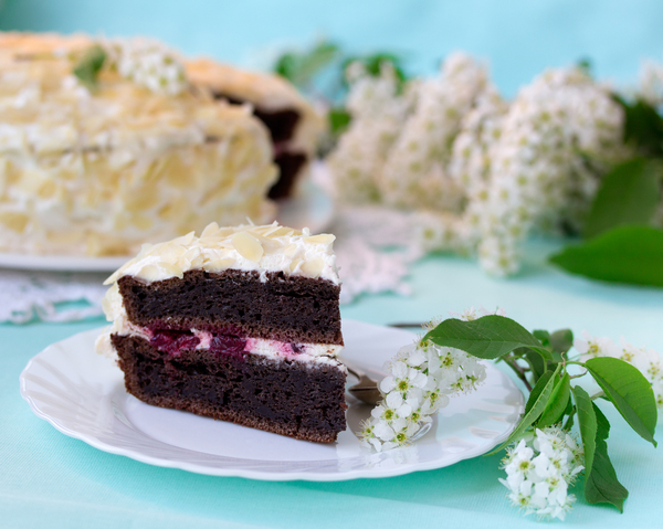 3. Сметану для крема взбить вместе с сахарной пудрой и ванилью. Выложить часть крема на нижний корж, разложить вишни и накрыть верхним пластом теста. Смазать сметанным кремом верх и бока торта, украсить миндальными хлопьями. Отправить в холодильник на 2-3 часа.