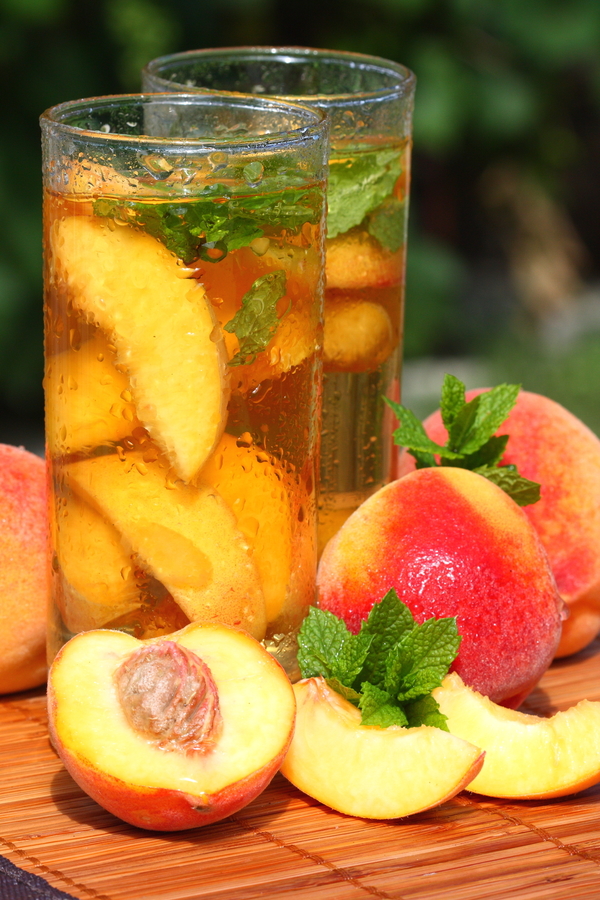 4. В охлажденный чай добавить мед, кубики льда и несколько ломтиков свежего персика. Разлить по стаканам и украсить веточками мяты.