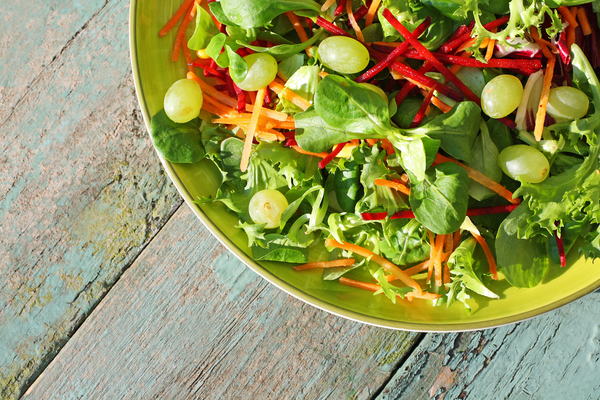 3. На тарелку выложить листовой салат и шпинат. Сверху разложить виноград и морковь.