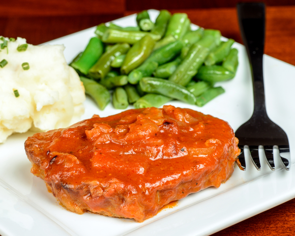 6. Перед подачей мясо нарезать. Выложить по стейку на каждую тарелку вместе с ложкой соуса и гарниром.