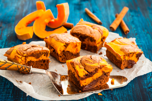 4. Разделить тесто на две части. Добавить шоколадную смесь в одну миску. В другой миске смешать тыквенное пюре, растительное масло, корицу и мускатный орех. Переложить половину шоколадного теста в подготовленную форму, разровнять. Покрыть половиной тыквенного теста. Повторить слои.