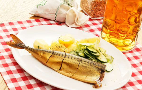 Копченая скумбрия, картофельный салат и свежие овощи – простая и вкусная закуска к пиву. Это отличное блюдо для Октоберфеста, который в 2015 году пройдет с 19 сентября по 4 октября.