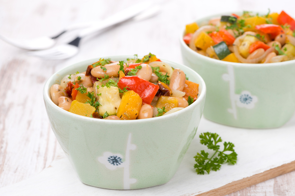 Вегетарианское рагу из тыквы, сладкого перца, кабачков и фасоли хорошо подойдет для легкого осеннего обеда.
