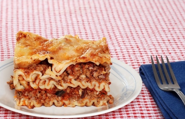 4. В форму налить немного соуса, выложить два листа лазаньи рядом. Сверху распределить часть фарша и немного сыра. Полить небольшим количеством бешамеля. Повторить слои. Верхний слой полить соусом и посыпать остатками сыра.