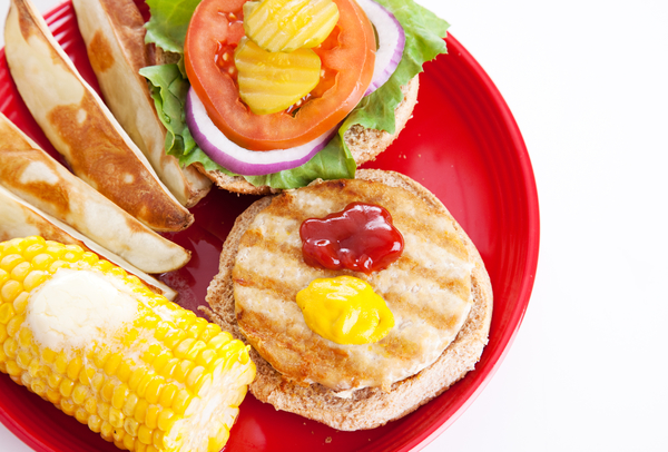 3. Подавать котлеты из индейки вместе с булочками, кетчупом, горчицей и овощами.