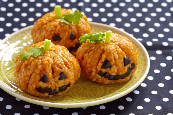 2. Сформировать шарики из риса размером с мяч для гольфа. Чтобы сделать глаза и рты, вырезать их из маслин и вдавить в рисовые шарики.