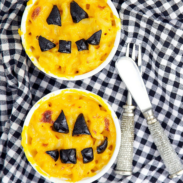 Для этой вкусной запеканки, создающей праздничное настроение на Хэллоуин, понадобятся макароны, сыр, морковный сок и маслины.