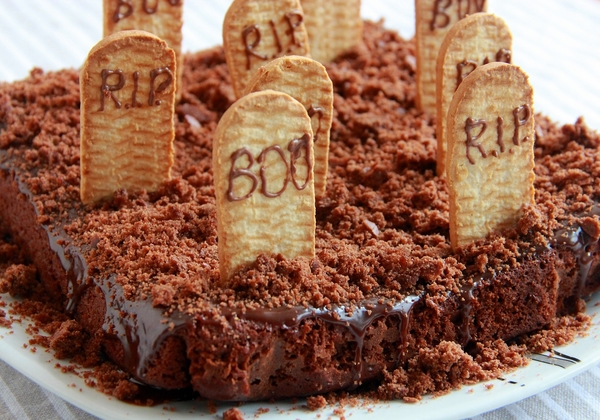 9. Растопить маленький кусочек шоколада, переложить в плотный пакет со срезанным очень маленьким уголком. Нарисовать на печеньях надписи Boo и R.I.P.