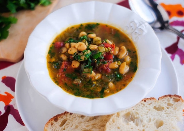 Пряный вегетарианский суп с помидорами, кинзой, сельдереем и белой фасолью хорошо согреет осенью.