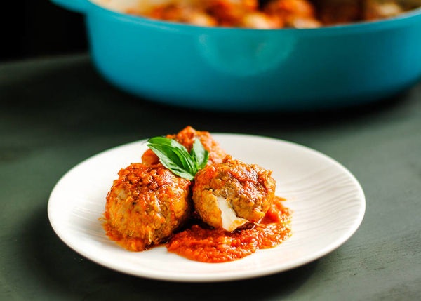 2. Разделить фарш на 20 частей. Сформировать тефтели, положив внутрь по шарику моцареллы.