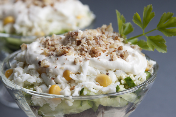 6. Для заправки перемешать сметану с майонезом, посолить и поперчить по вкусу.