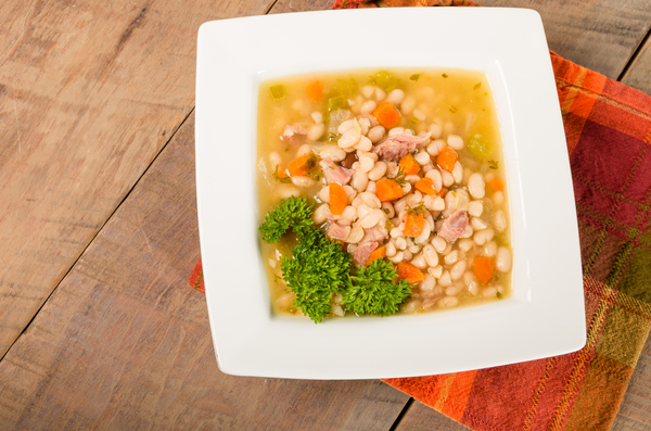 4. Добавить овощи и фасоль в бульон. Варить 40 минут, или пока овощи не станут мягкими и мясо не будет легко отделяться от кости. Вынуть голяшку из супа, срезать мясо и вернуть его в суп. Кости выбросить.