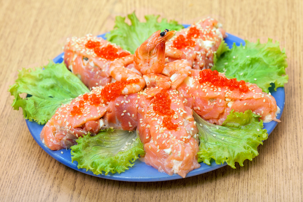 3. Украсить закуску красной икрой, кунжутом и вареными креветками.