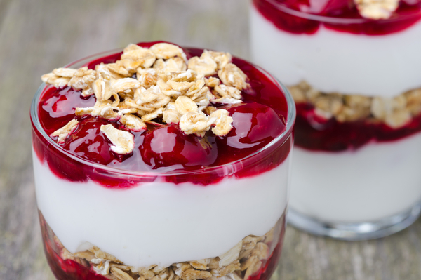 2. В порционные стаканчики всыпать немного мюсли, а затем слоями выложить ягодное пюре и йогурт. Украсить ягодами и мюсли; подавай сразу же.