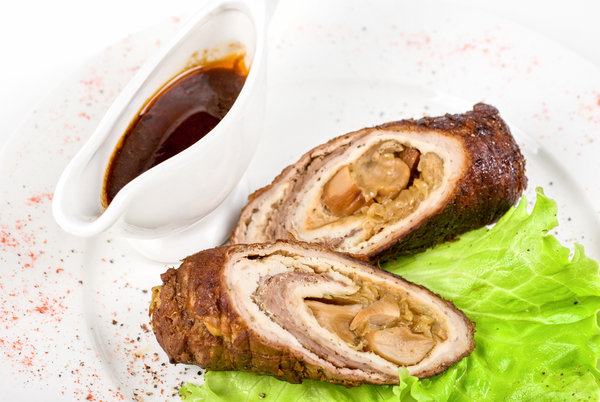 7. Процедить соус через сито в кастрюлю. Удалить зубочистки, которыми были скреплены рулеты. Подавать нарезанное мясо вместе с соусом.