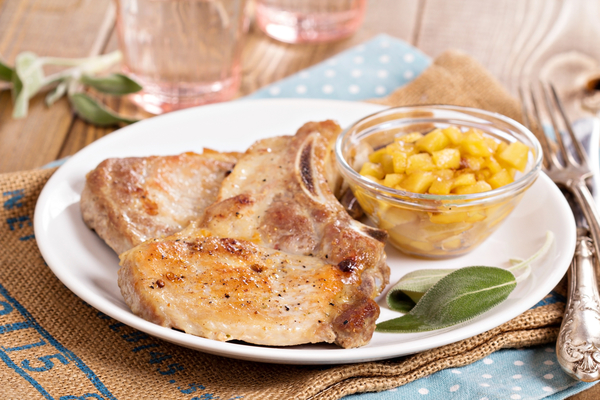 1. Разогреть духовку до 200 градусов. Нагреть 2 столовые ложки оливкового масла в жаропрочной сковороде на среднем огне. Посолить и поперчить с обеих сторон свиные отбивные; добавить в сковороду. Жарить до золотисто-коричневого цвета. Перевернуть и обжарить с другой стороны. Поставить сковороду в духовку и готовить около 5-10 минут. Из готового мяса при прокалывании должен выделяться прозрачный сок.