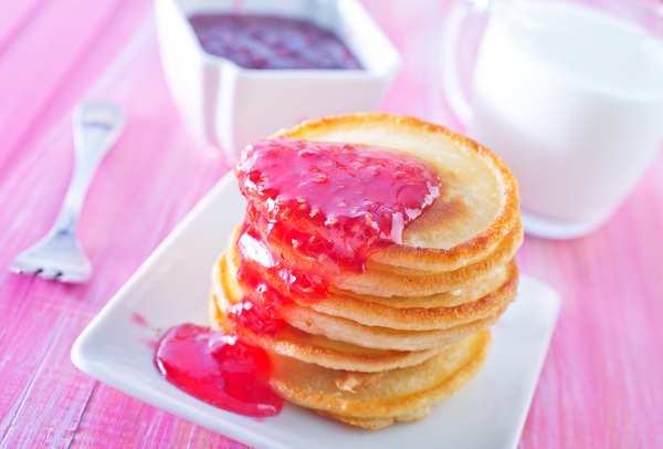 5. Готовые оладьи подавать вместе с малиновым джемом или сметаной.