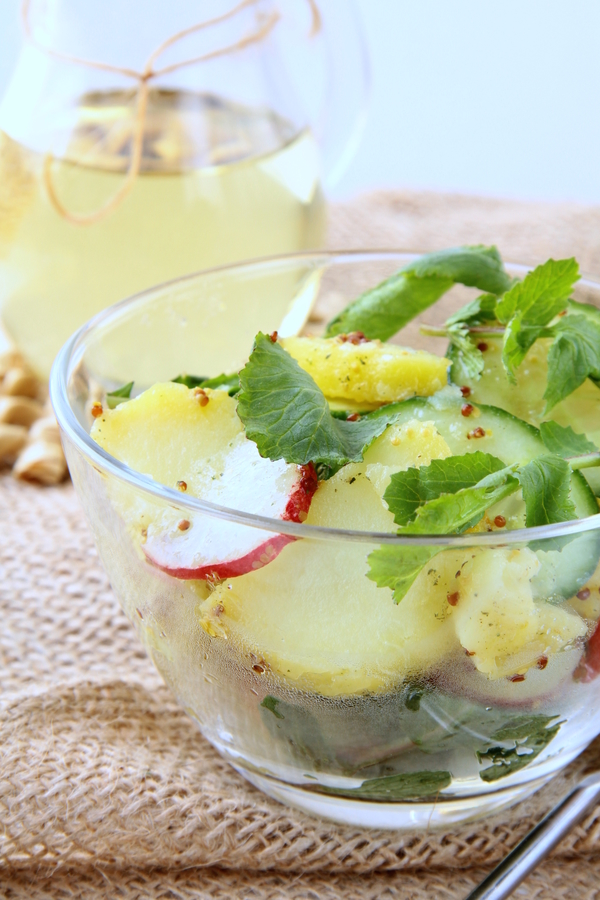 1. Картофель очистить и отварить. Горячим нарезать на кружочки и залить маринадом из смеси растительного масла, лимонного сока, горчицы и меда и оставить на час.