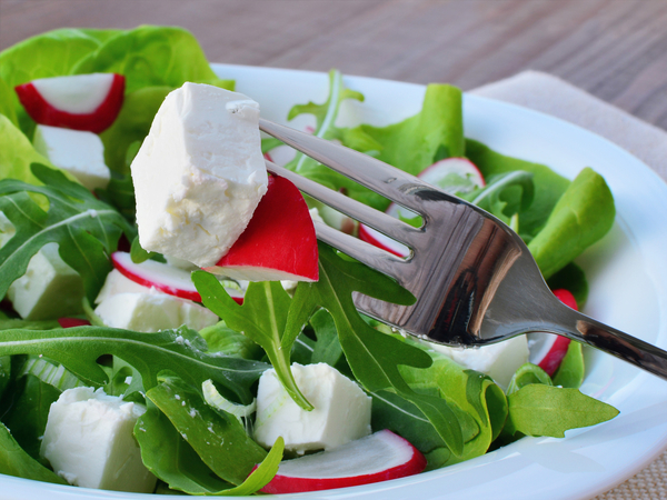 4. Смешать в салатнице зелень, редис и сыр. Полить оливковым маслом и лимонным соком. Посолить и поперчить.