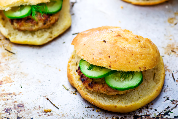 Не знаешь, какую еду взять на пикник? Приготовь домашние бургеры с курицей и огурцами.
