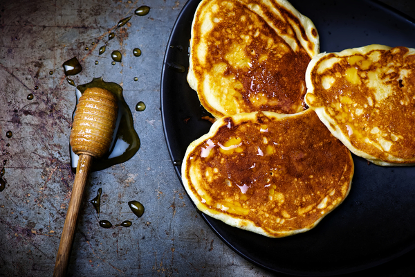 4. Разогреть сковороду, смазанную маслом. Столовой ложкой выкладывать тесто на сковороду (около 3 ст.л. на каждый блин) и жарить с двух сторон до золотистого цвета. Подавать блины с медом или вареньем.