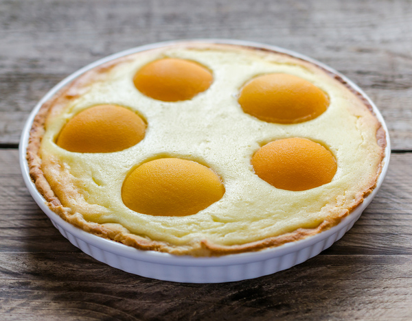 3. Для начинки смешать перетертый через сито творог, сахар, цедру лимона, яйца, крахмал и выложить на тартинку. Сверху разложить консервированные персики, слегка вдавливая их в творог.
