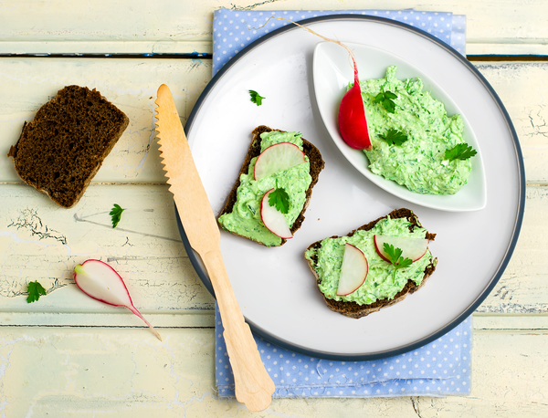 Подавай творожную массу с зеленью и чесноком вместе с цельнозерновым хлебом и кусочками овощей.